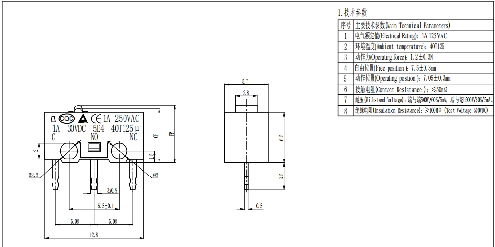 Gamit ang isang patentadong snap-action na mabilis na mekanismo ng trigger, ang oras ng pagtugon ng trigger ay ≤8ms, pagpapabuti ng pagganap ng 25% kumpara sa tradisyonal na mga switch ng micro. Ang paglalakbay sa pag-trigger ay tiyak na kinokontrol sa pagitan ng 0.3-1.0mm, na may isang saklaw ng lakas ng operating na 1.5-4N. Ang pagpindot ng feedback ay malinaw at presko, nang walang pagdikit o libreng pag -play, na nagpapahintulot para sa tumpak na kontrol ng 'light touch upang kumonekta, ilabas upang masira,' perpektong angkop para sa mga senaryo na nangangailangan ng mataas na sensitivity ng trigger. Ang mga contact ay gawa sa mataas na kadalisayan na pilak-tining haluang metal at naproseso na may tumpak na welding ng lugar, na may paunang paglaban sa contact ng ≤30MΩ. Sinusuportahan ng na -rate na pag -load ang 1A/250V AC at 3A/125V AC, na epektibong pumipigil sa pag -init ng contact o pagkasunog kapag kasalukuyang dumadaan.